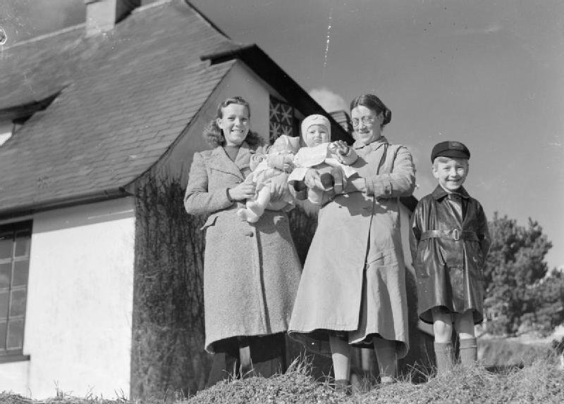 Mrs Findlayson (left, with her 2-month-old daughter Sheila), and Mrs Phillips (with her sons, 9-month-old Roland and 6-year-old Roy) smile for the camera in the sunshine outside the ‘Love Nest’ in Thurlestone, Devon. Mrs Findlayson and Mrs Phillips have been evacuated to this communal hostel and are caretakers of this rest home, attached to the hostel, which is used by husbands visiting their wives at the Communal Billets whilst home on leave.
