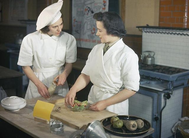 A voluntary domestic science course for service women based in the London area, organised by the London District of the Army Education Scheme, with the co-operation of the London County Council, at Avondale Park School, Notting Hill Gate, London. In this picture the Chief Instructor of the course, Mrs Evans, shows Corporal Margaret Dener how to make a salad.